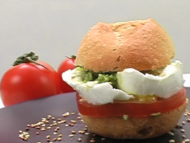 Сендвич с самым популярным соусом итальянской кухни на основе оливкового масла, базилика и сыра.Состав:булочки — 4 штуки;помидоры — 3 штуки;пармезан — 100 гр;несколько веточек базилика;арахис — 50 гр;чеснок — 1 долька;моцарелла — 1 порция;оливковое масло, перец, соль — по вкусу. Язык: Русский