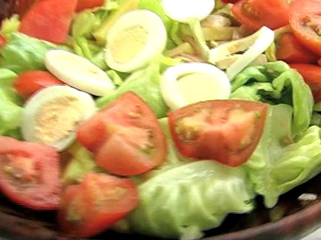 Рецепт легкого и свежего салата.Состав: яйца — 2 штуки;ветчина — 3 кусочка;грюэрский сыр — 3 кусочка;салат-латук — 1 качан;помидора — 3 штуки;чеснок — 2 зубчика;морская соль, белый перец, оливковое масло, уксус хереса. Язык: Русский