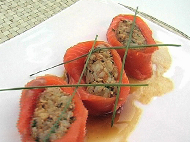 Специальные суши с лосовем и угрем.Состав:угорь — 30 гр;лосось — 50 гр;сокполовинки лимона;зеленый лук — 1 чайная ложка;кунжут — 1 чайная ложка;рис — 80 гр;соевый соус, васаби, черный перец — по вкусу. Язык: Русский